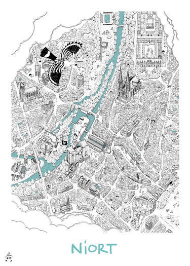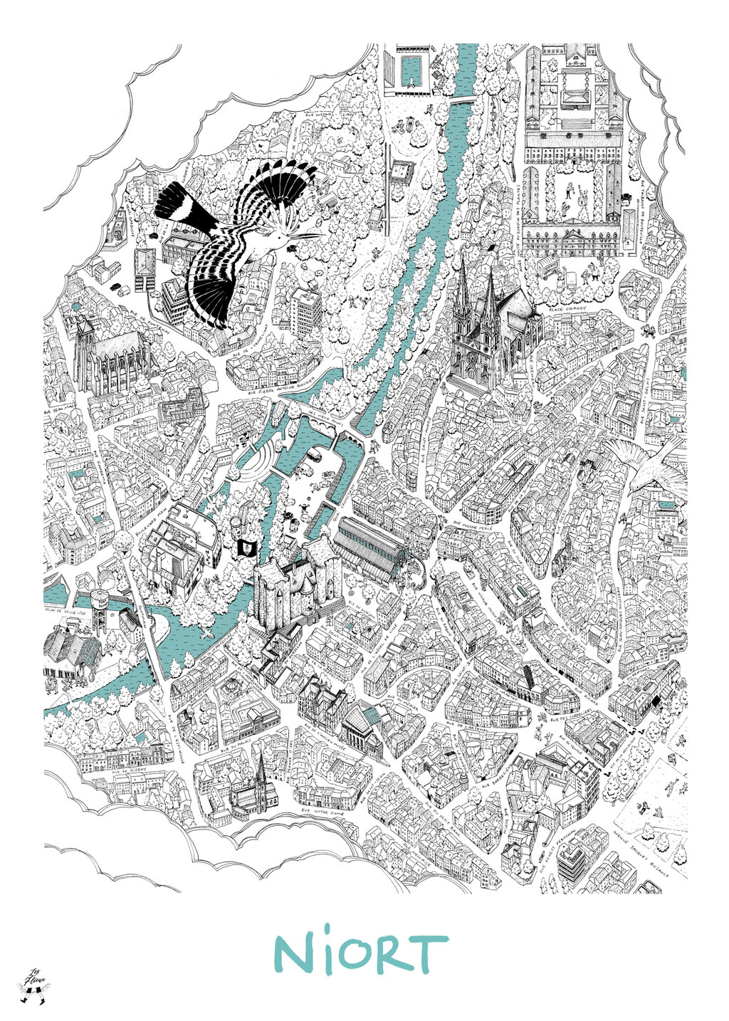 Découvrez la nouvelle carte du Niort historique en vue cavalière, maintenant disponible dans les boutiques des musées de Niort Agglo, une création signée et unique de Samy Dion, artiste de La Rochelle spécialisé dans les perspectives urbaines artistiques.